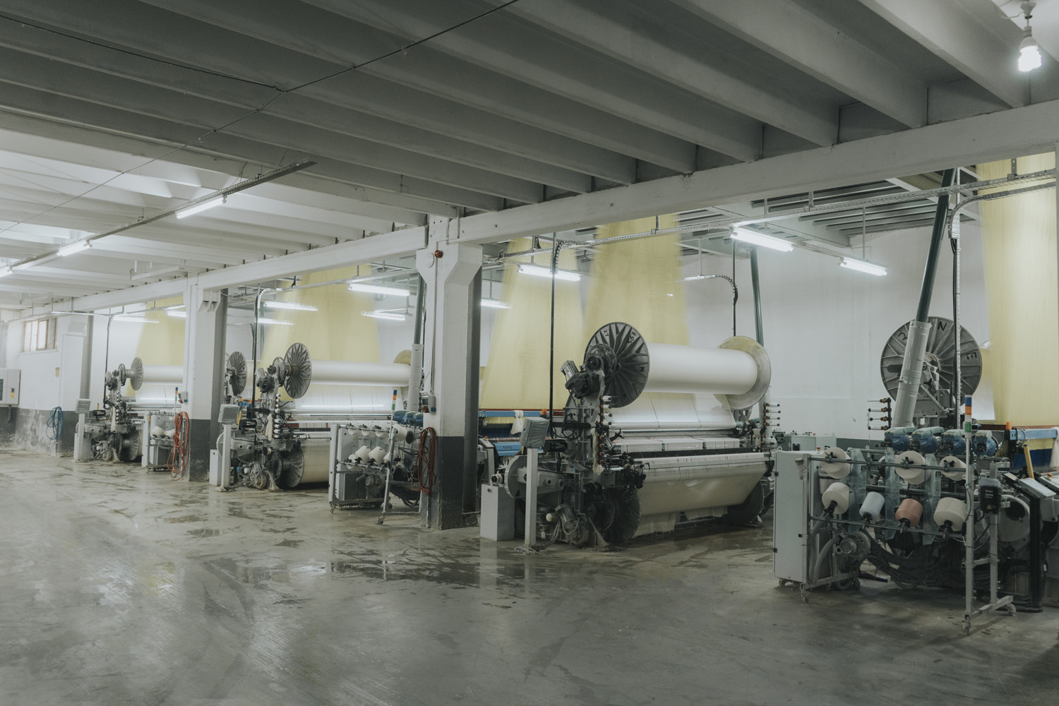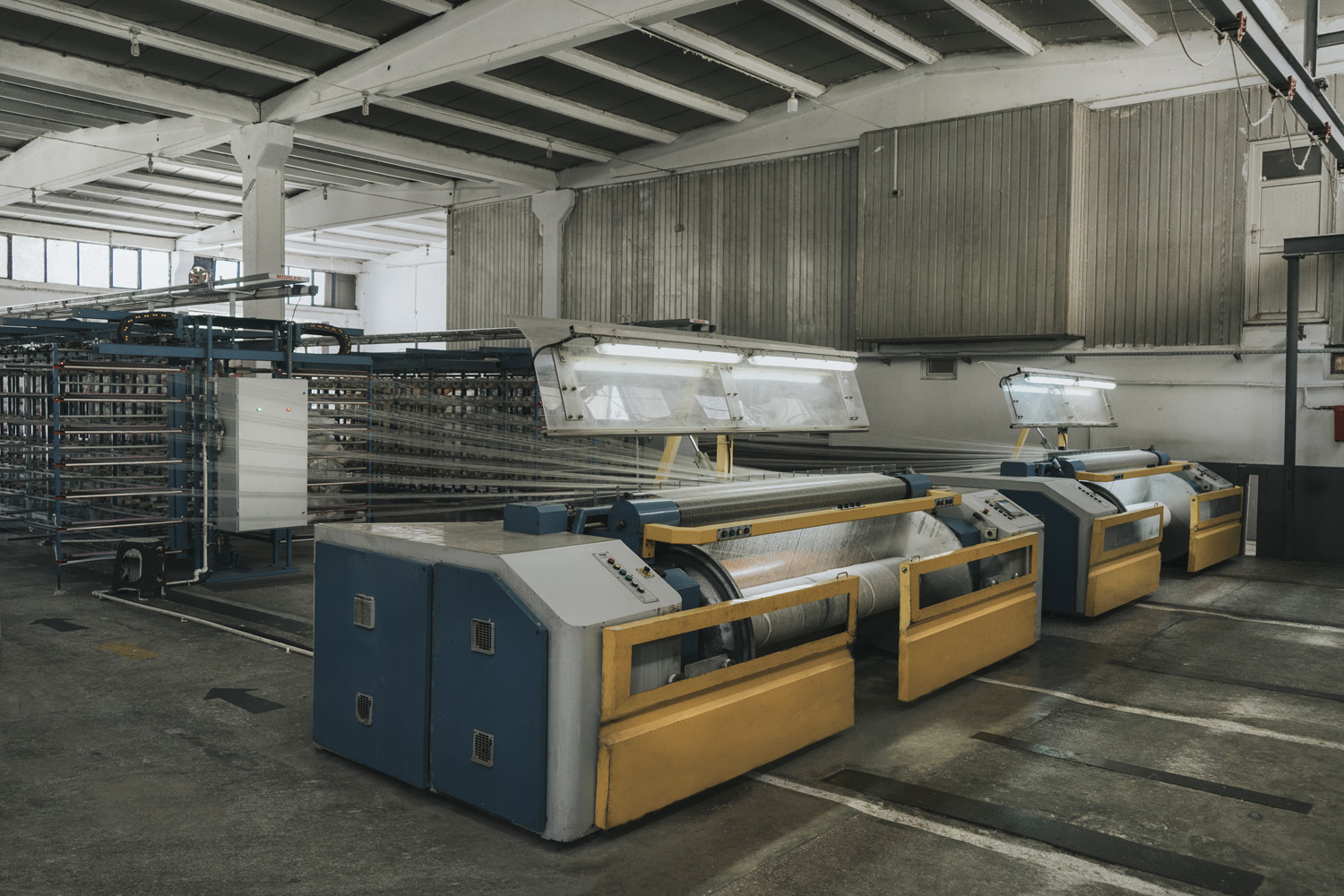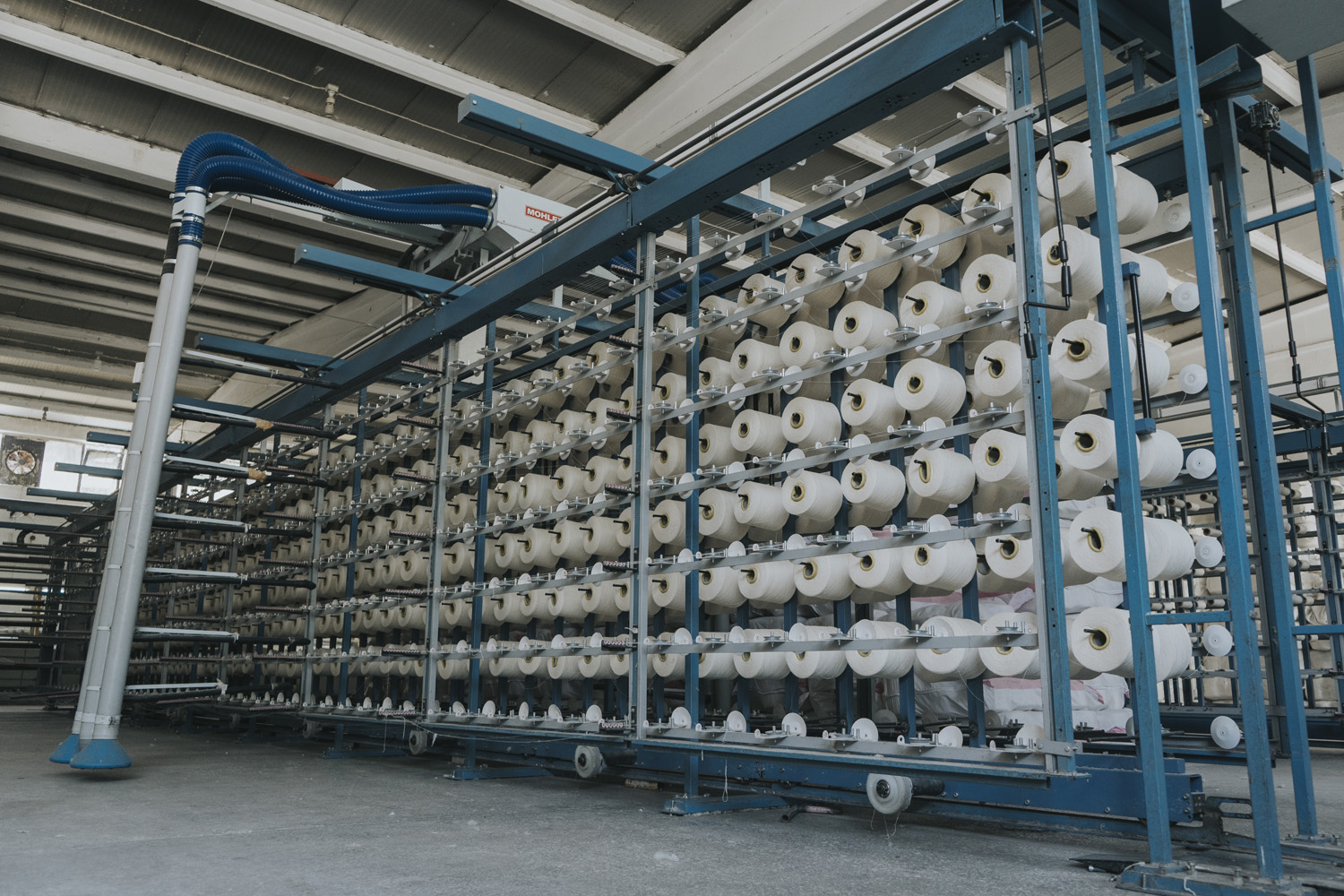 The first step of production begins with the arrival of yarn bobbins to the sizing unit for weaving preparation.